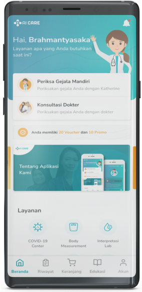 Konsultasi dokter adalah salah satu layanan utama aplikasi Ai Care di mana Anda dapat memeriksa gejala Anda secara virtual dengan dokter umum, dokter spesialis, serta tenaga kesehatan lainnya. Layanan ini berupaya memberikan pengalaman end-to-end di mana dokter dapat memberikan Anda edukasi, resep, atau rekomendasi rujukan yang sesuai dengan kondisi Anda. Layanan konsultasi dokter di Ai Care selalu mengusung nilai AI CARE: Accurate, In Safety, Confidential, Rapid Response, dan Expert.